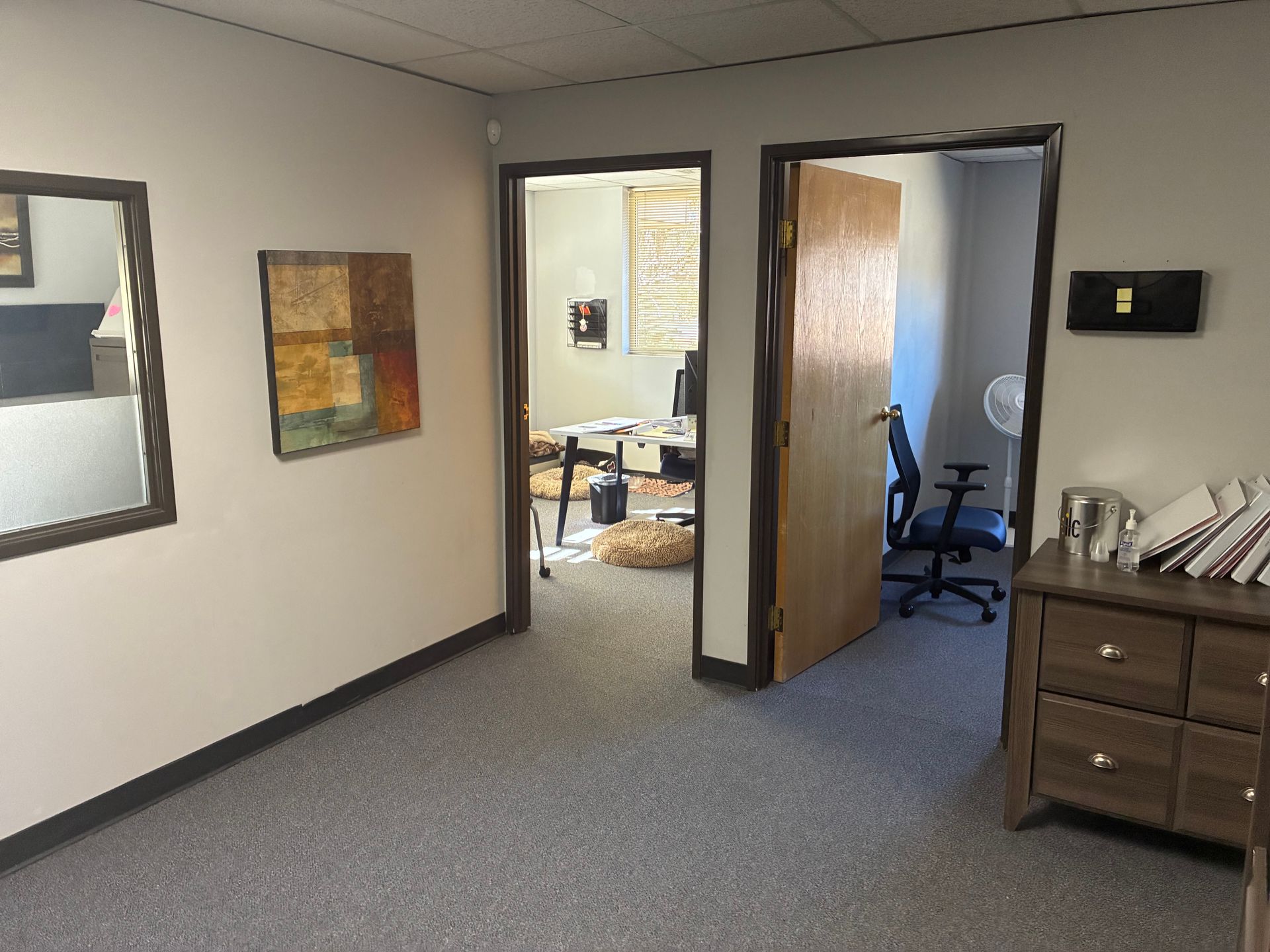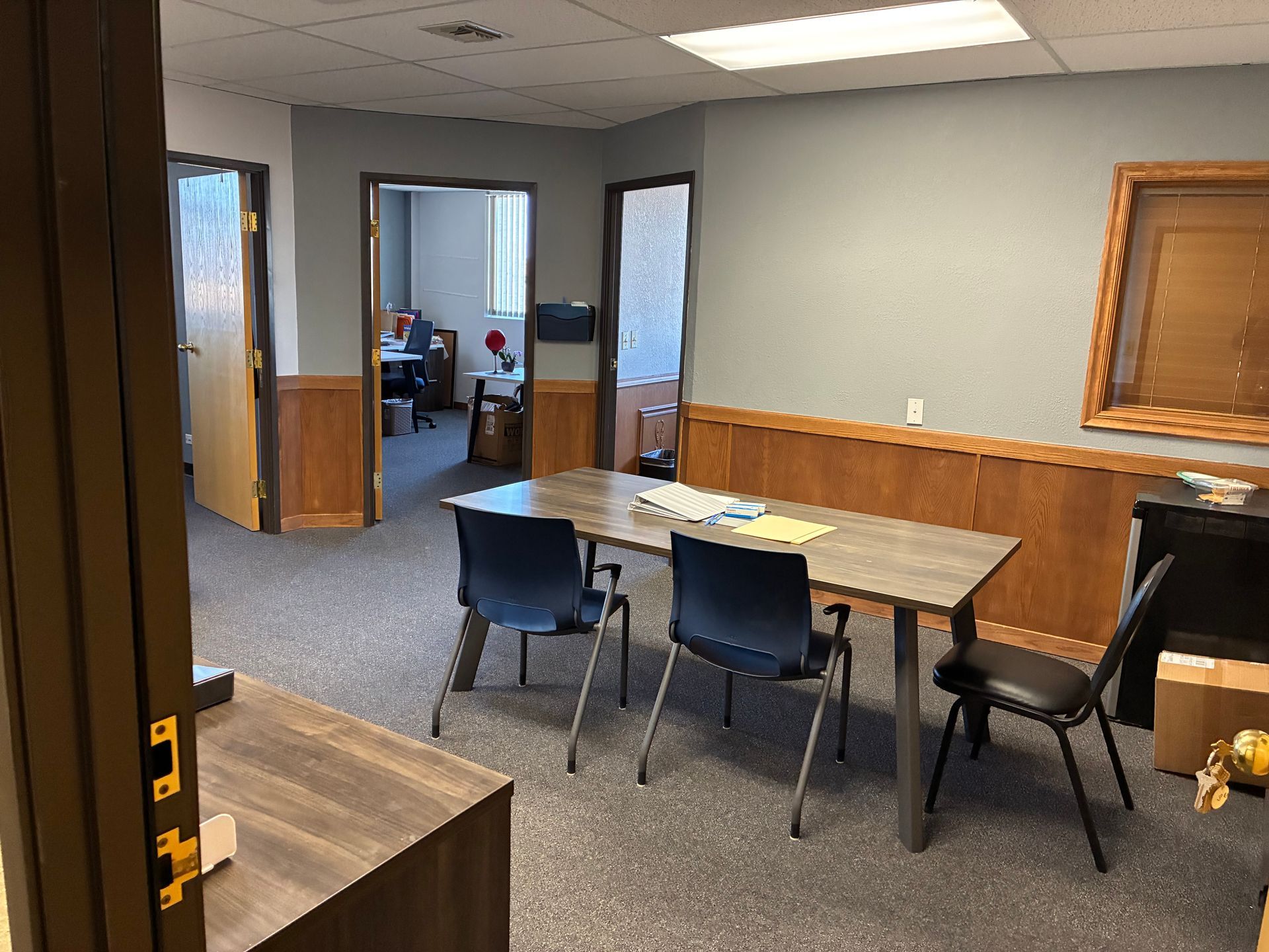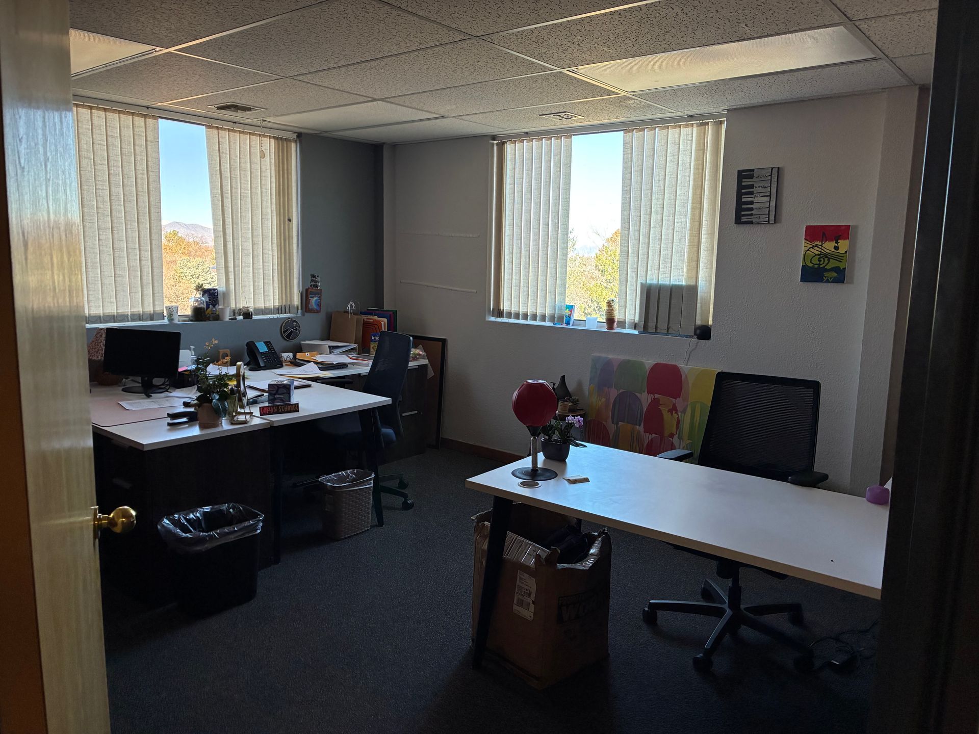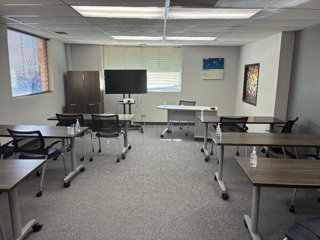 A 1,700 sq. ft. corner suite featuring large windows, a conference room, kitchen, three private offices, and a spacious open area used for training and group sessions that can also be divided into three additional offices, with beautiful western and southern views.