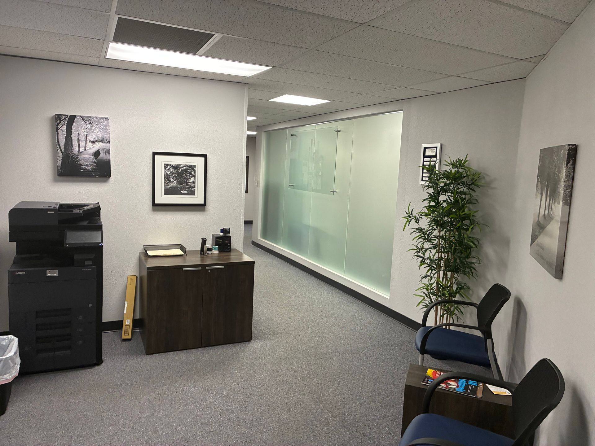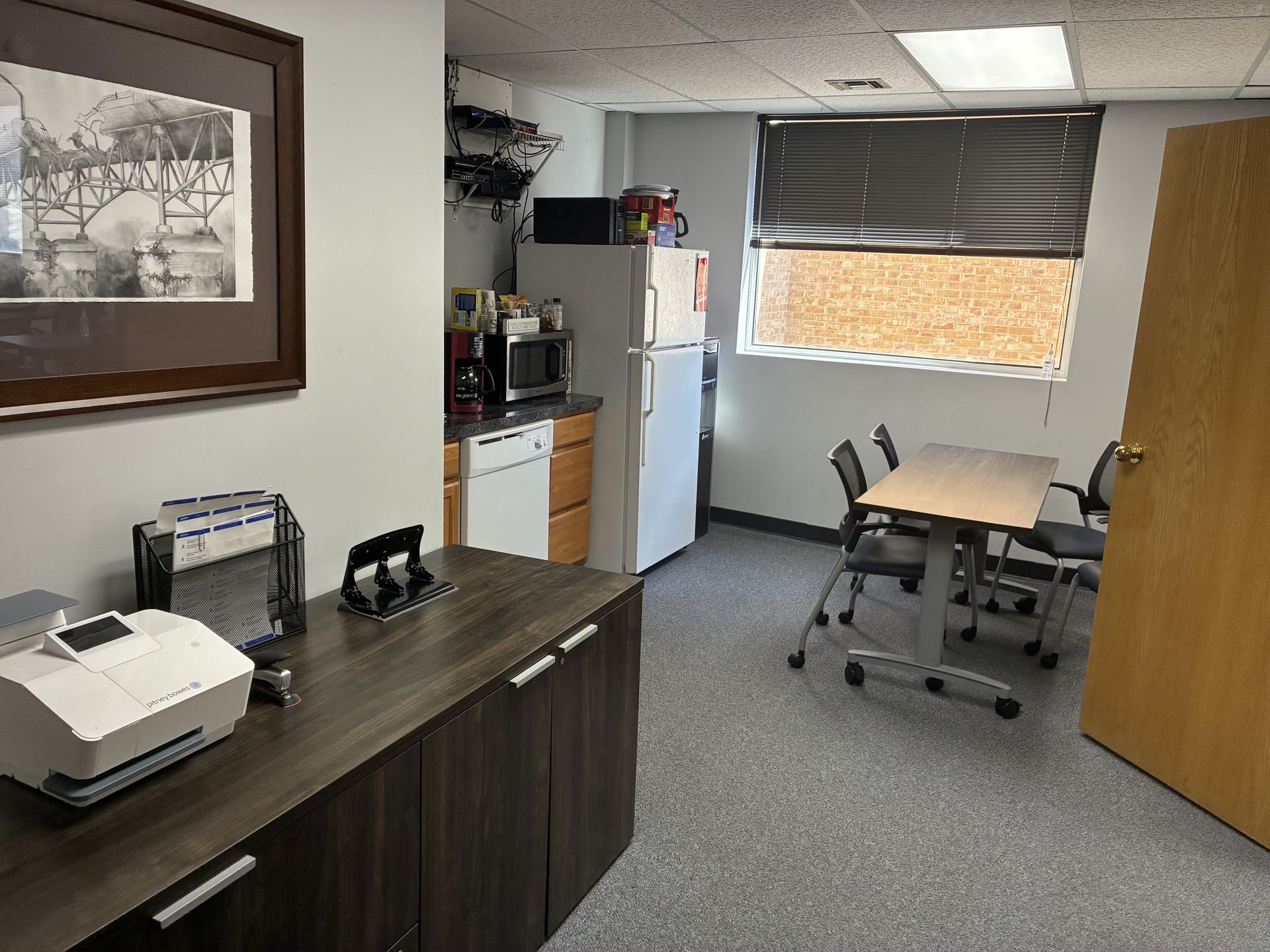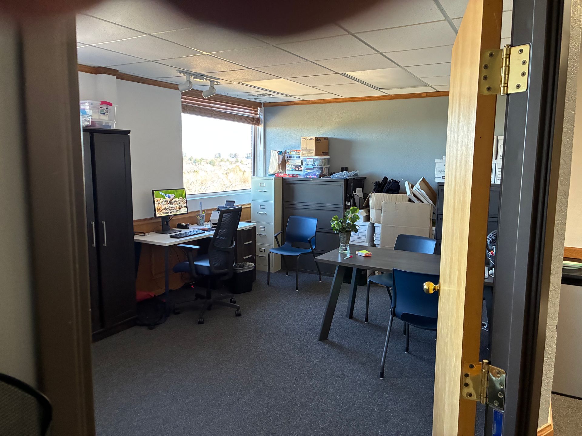 A 1,700 sq. ft. corner suite featuring large windows, a conference room, kitchen, three private offices, and a spacious open area used for training and group sessions that can also be divided into three additional offices, with beautiful western and southern views.